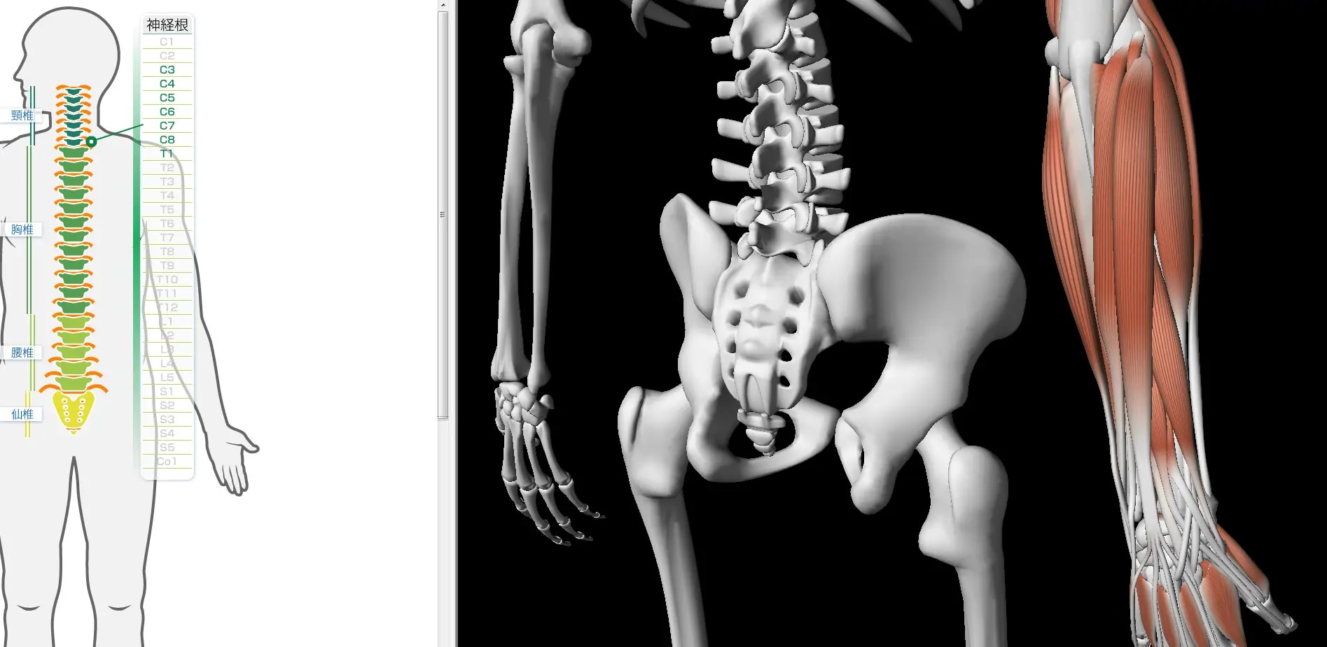- 骨のランドマーク(解剖学的特徴): 脊椎の棘突起を触診することで、脊椎のアライメントと可動性を評価することができます。親指や他の指を使って、個々の棘突起の位置を確認し、圧痛、偏位、異常な可動性を評価することができます。