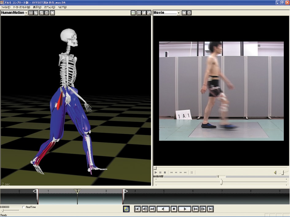 ARMOは、筋活動レベルでの運動理解を目的とした画期的な動作分析ソフトウエアです。筋骨格系モデルとモーションデータ、外力データより筋力・消費カロリーを推定計算し、高品質な映像で身体運動をアニメーション表示します。