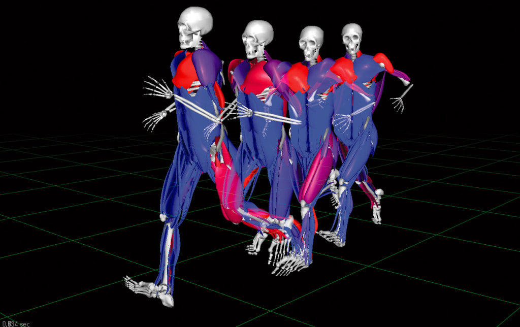 筋骨格系モデルに逆動力学を用いて計算した、各関節のトルクと、Hillの筋肉モデルを用いた最適化計算により筋力を推定します。 算出した各筋肉の発揮する筋力は、筋骨格系モデルにより分かり易く表示されます。