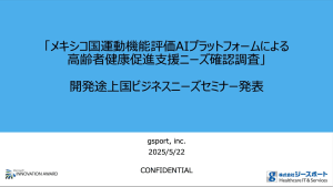 本セミナーでは、ジースポートがJICA Bizに採択された背景とともに、メキシコにおける予防医療の課題に対し、運動機能評価AIプラットフォームを用いた実証調査の概要を紹介しました。メキシコでは高齢化の進行に伴い、医療リソースの制約やリハビリ人材不足が深刻化しており、AIによる健康支援の必要性が高まっています。
